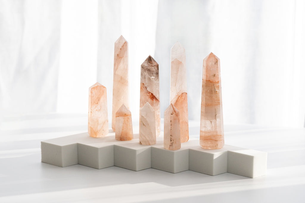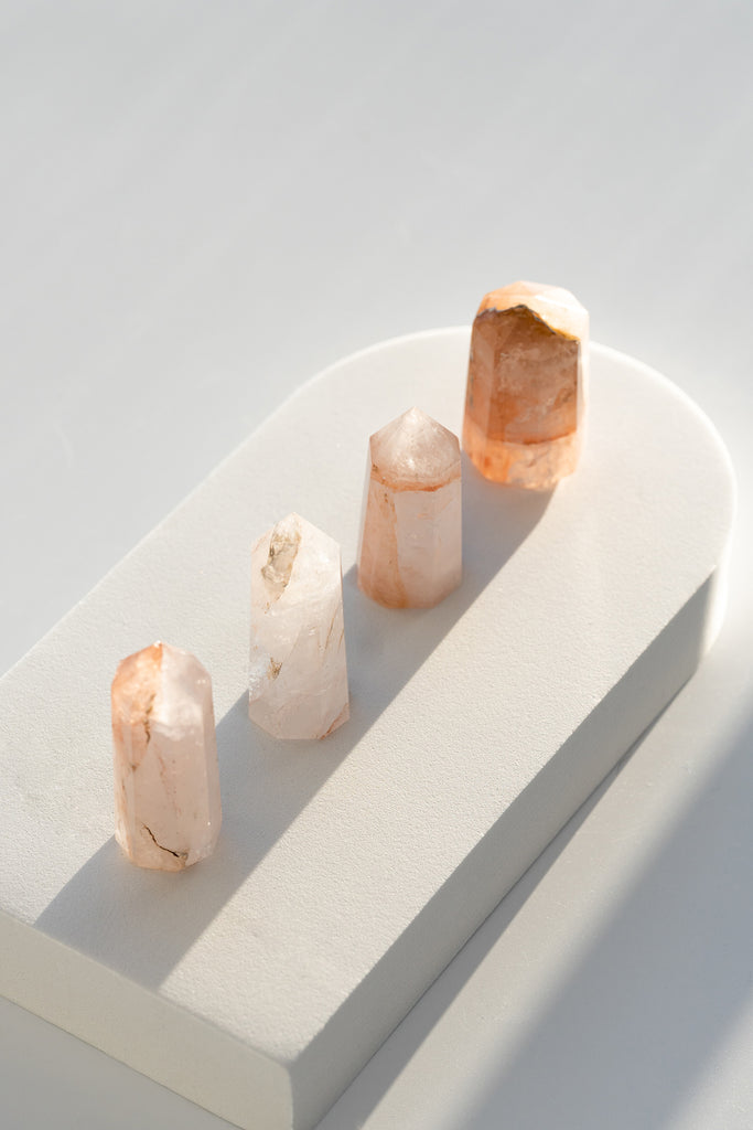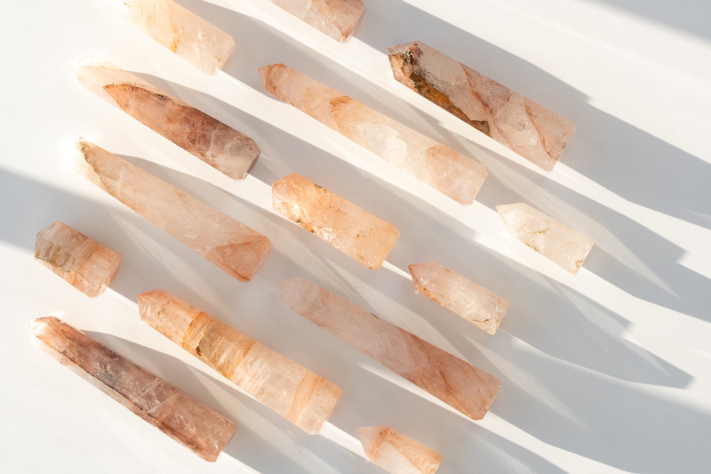Part of the clear quartz family these 8 faceted Hematoid Quartz points have inclusions of Hematite within.