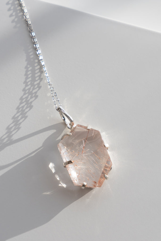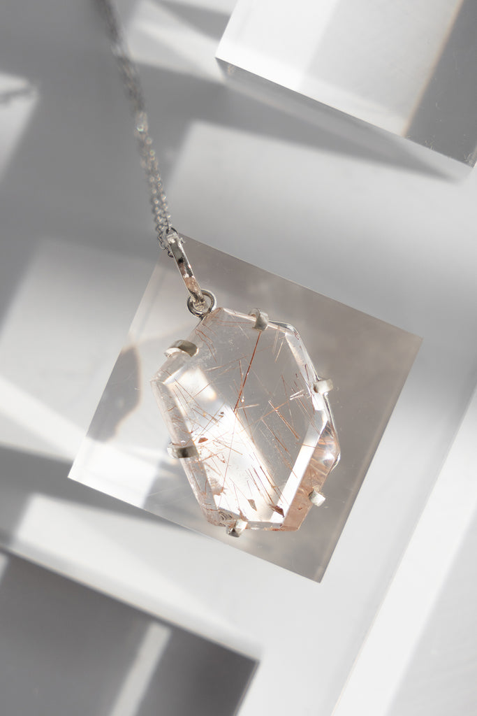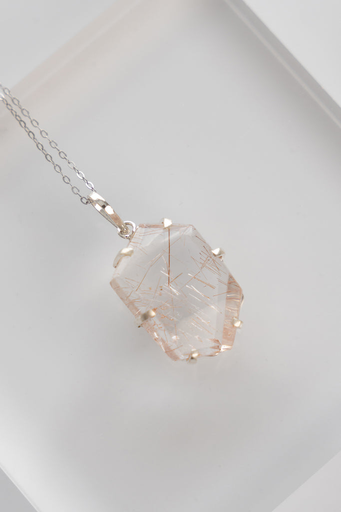 Faceted Rutile Clear Quartz Pendant Necklace, handcrafted in 925 Sterling Silver.