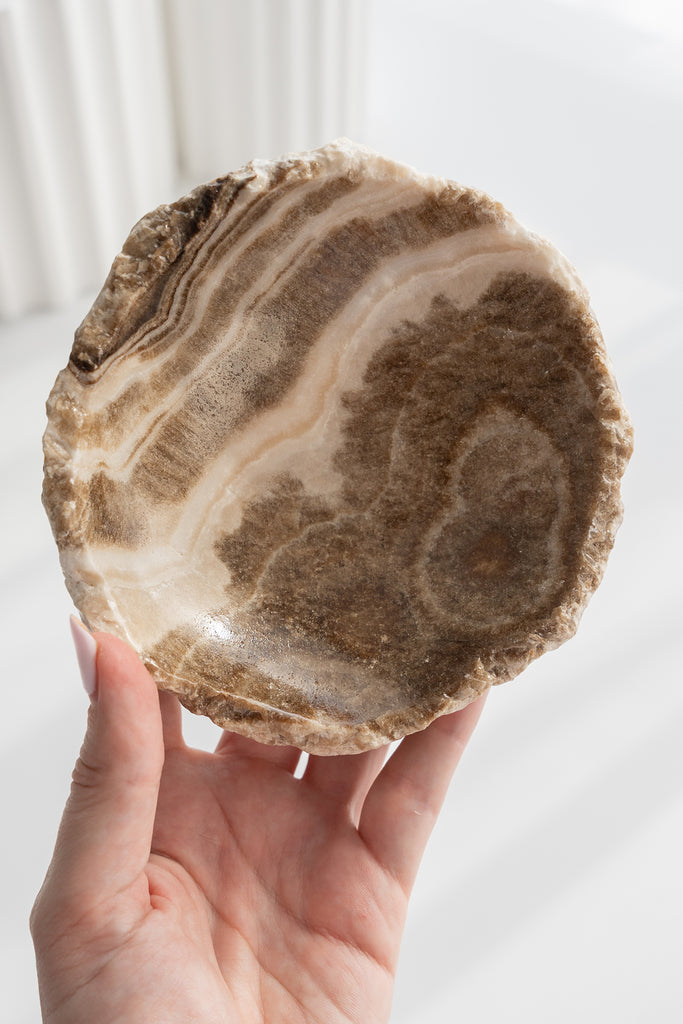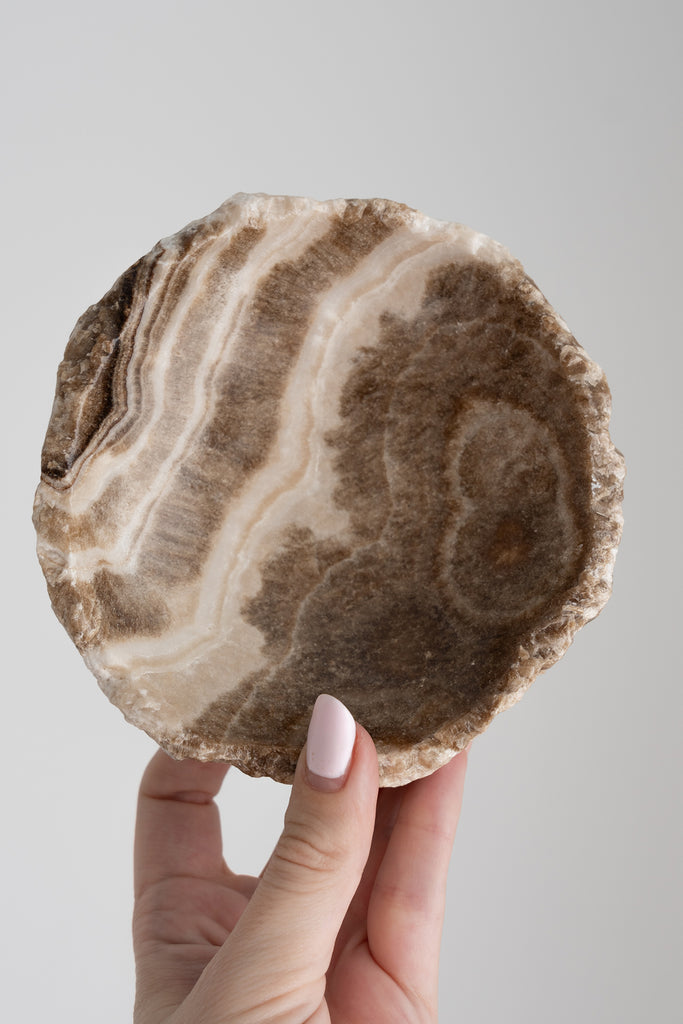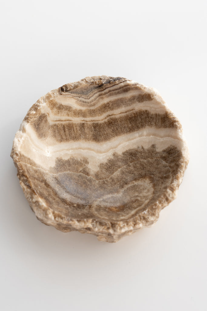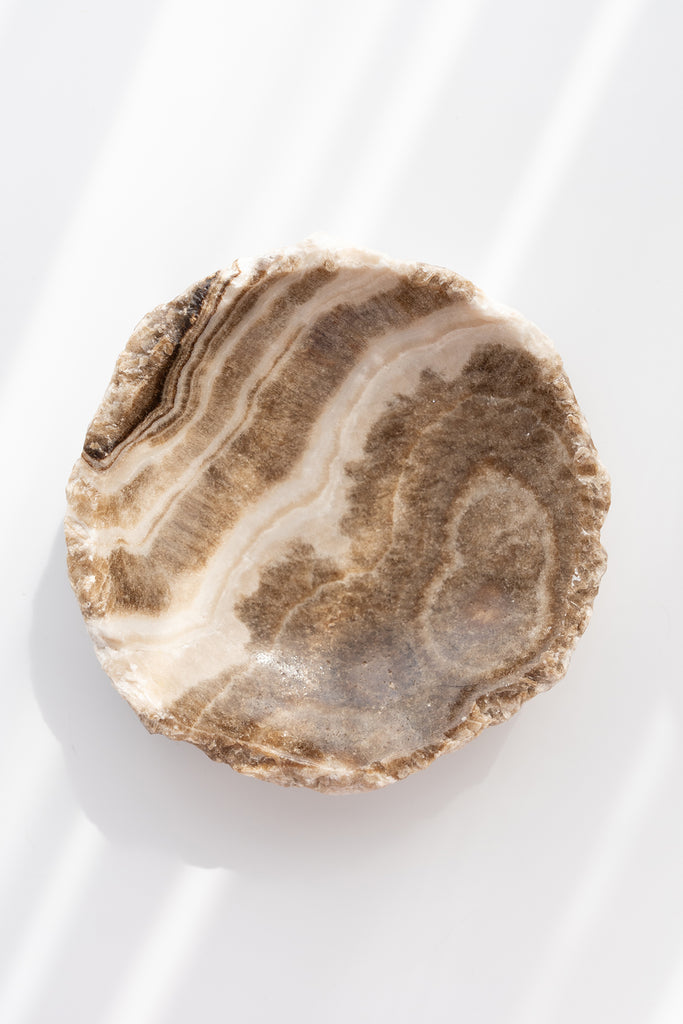Rich, earthy tones of brown and cream flow through this hand-polished Onyx bowl, featuring beautiful rustic edges. Its grounding palette and organic banding make it a warm, natural addition to any space.
