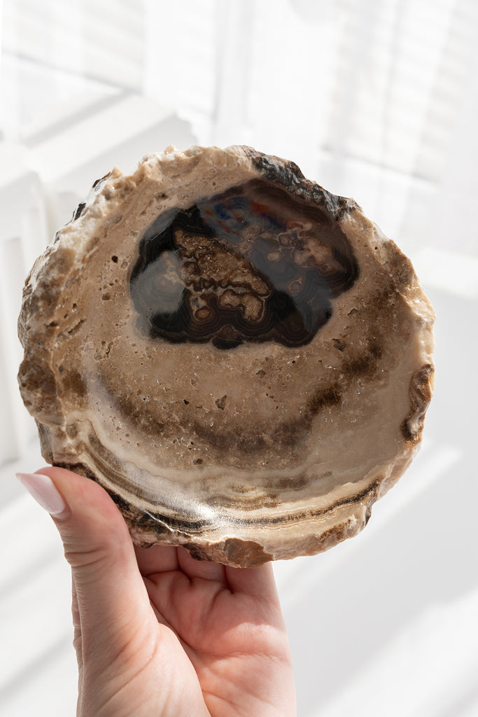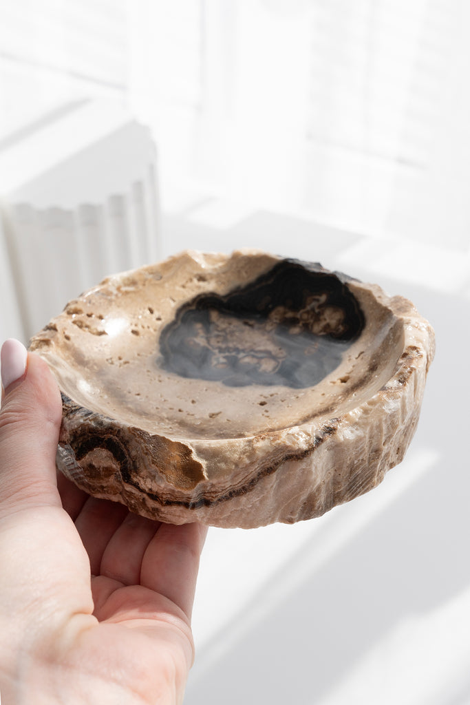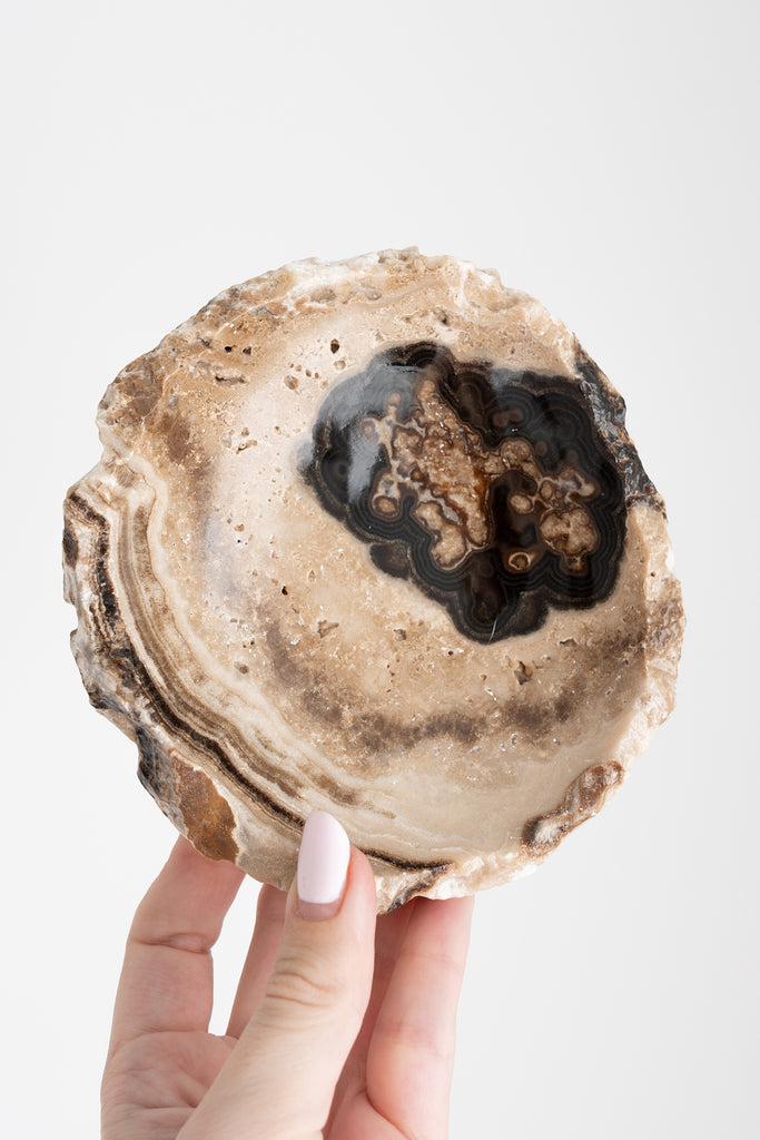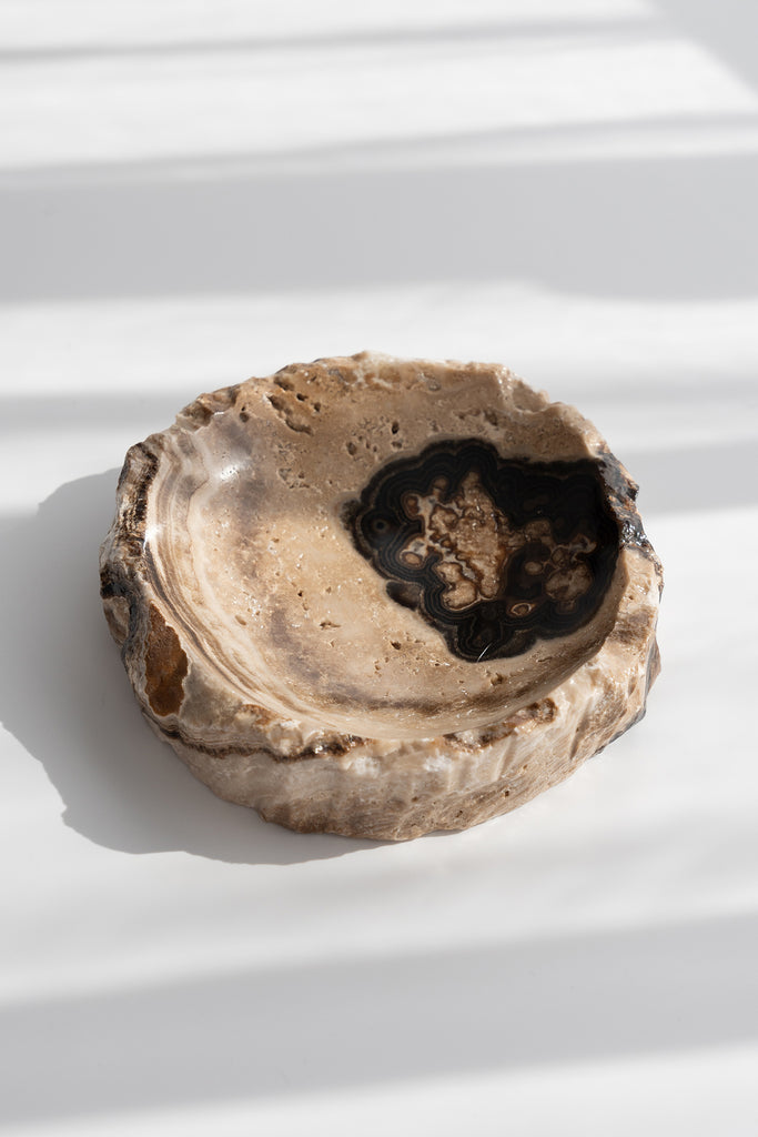 Rich, earthy tones of brown and cream flow through this hand-polished Onyx bowl, featuring beautiful rustic edges. Its grounding palette and organic banding make it a warm, natural addition to any space.