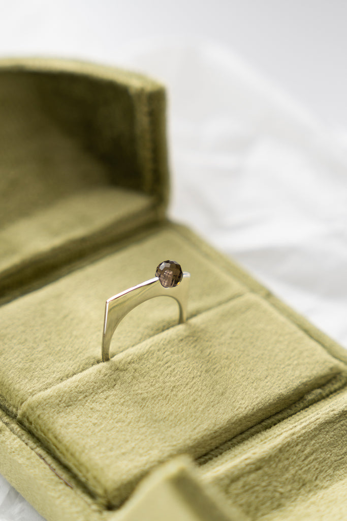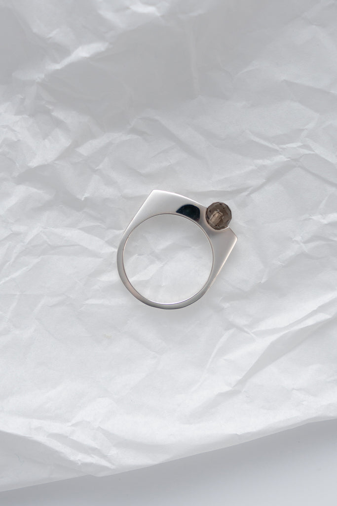 A considered, modern design featuring a faceted smoky quartz set in clean, structured lines. Finished with a thin, refined band, this piece highlights the stone’s natural depth and character.