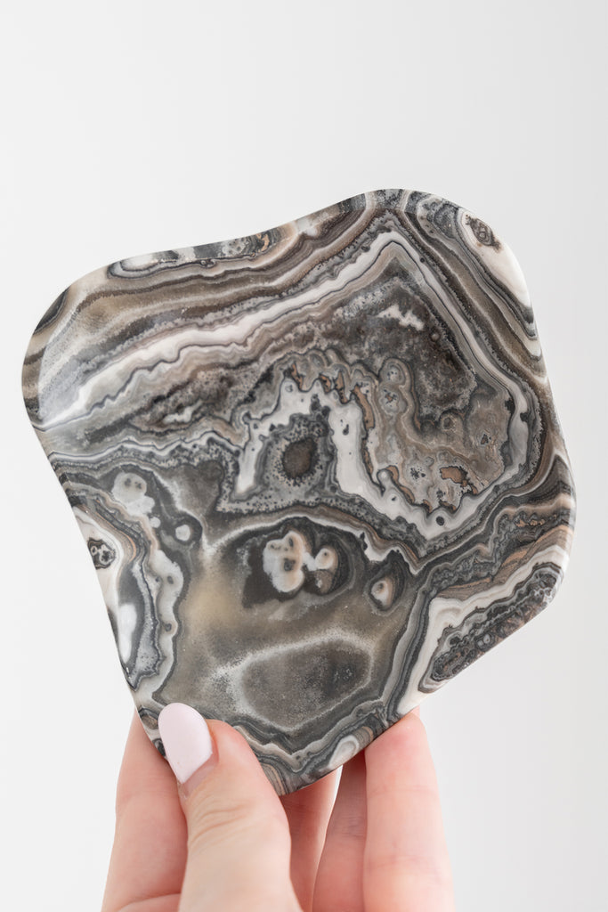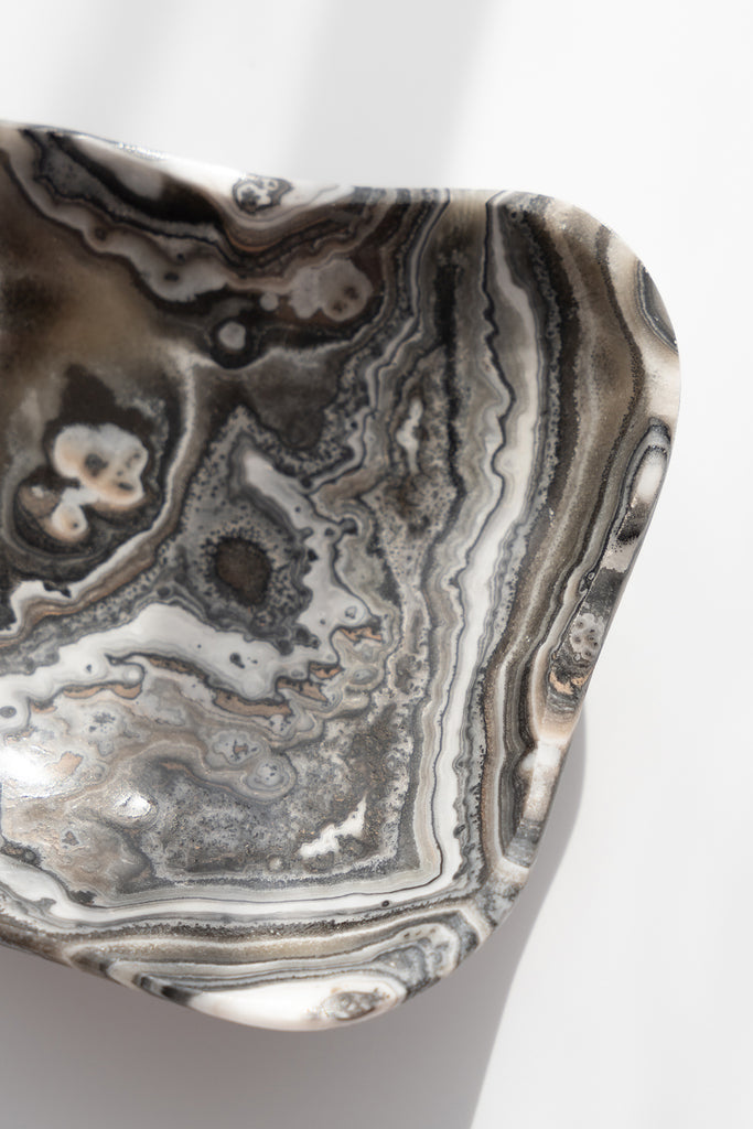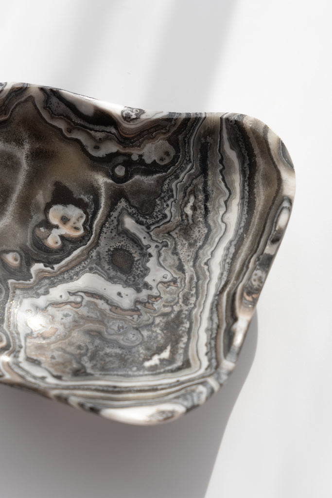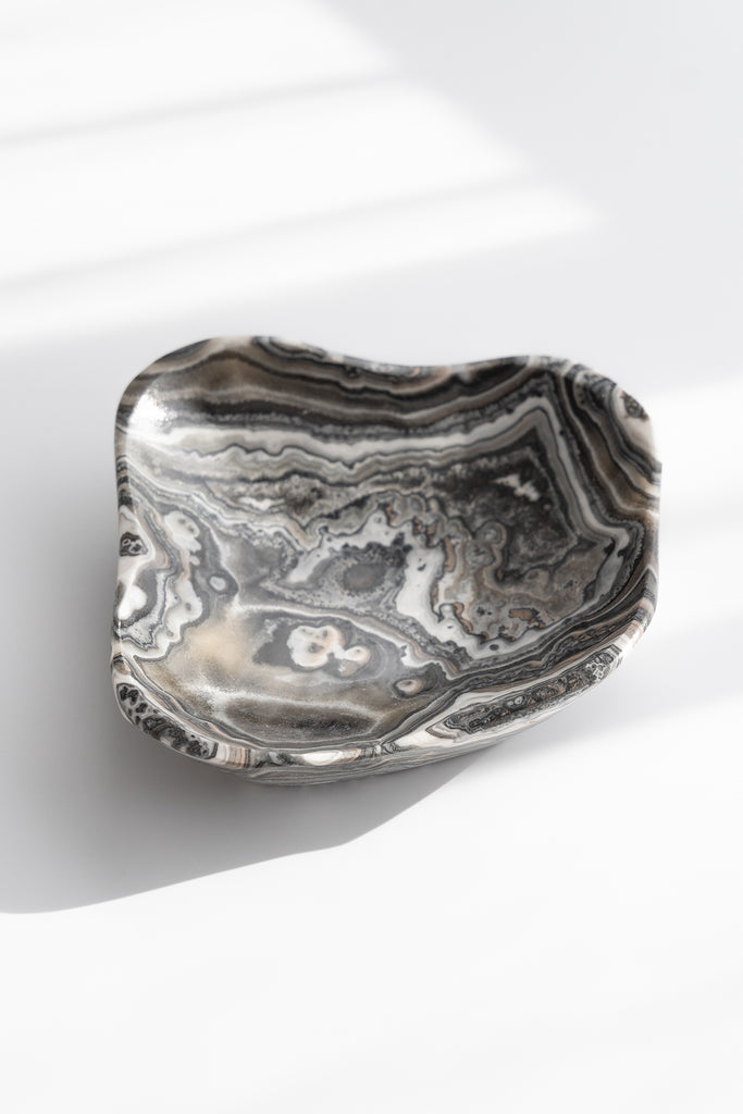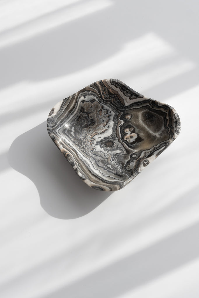 Hand-carved from natural Zebra Calcite and Onyx with layers of soft grey, cream, and beige. Each bowl has a gentle contrast and a smooth polished finish, adding a calm, neutral touch to any space.